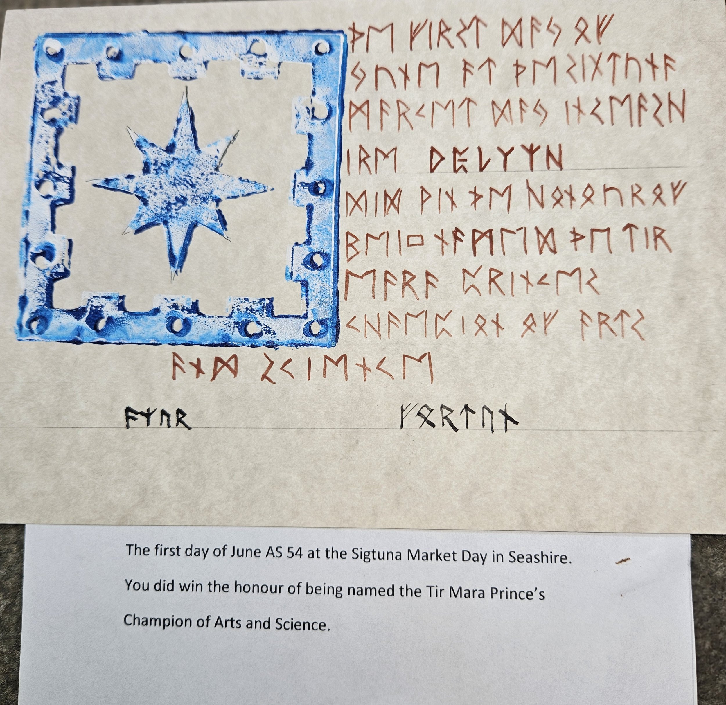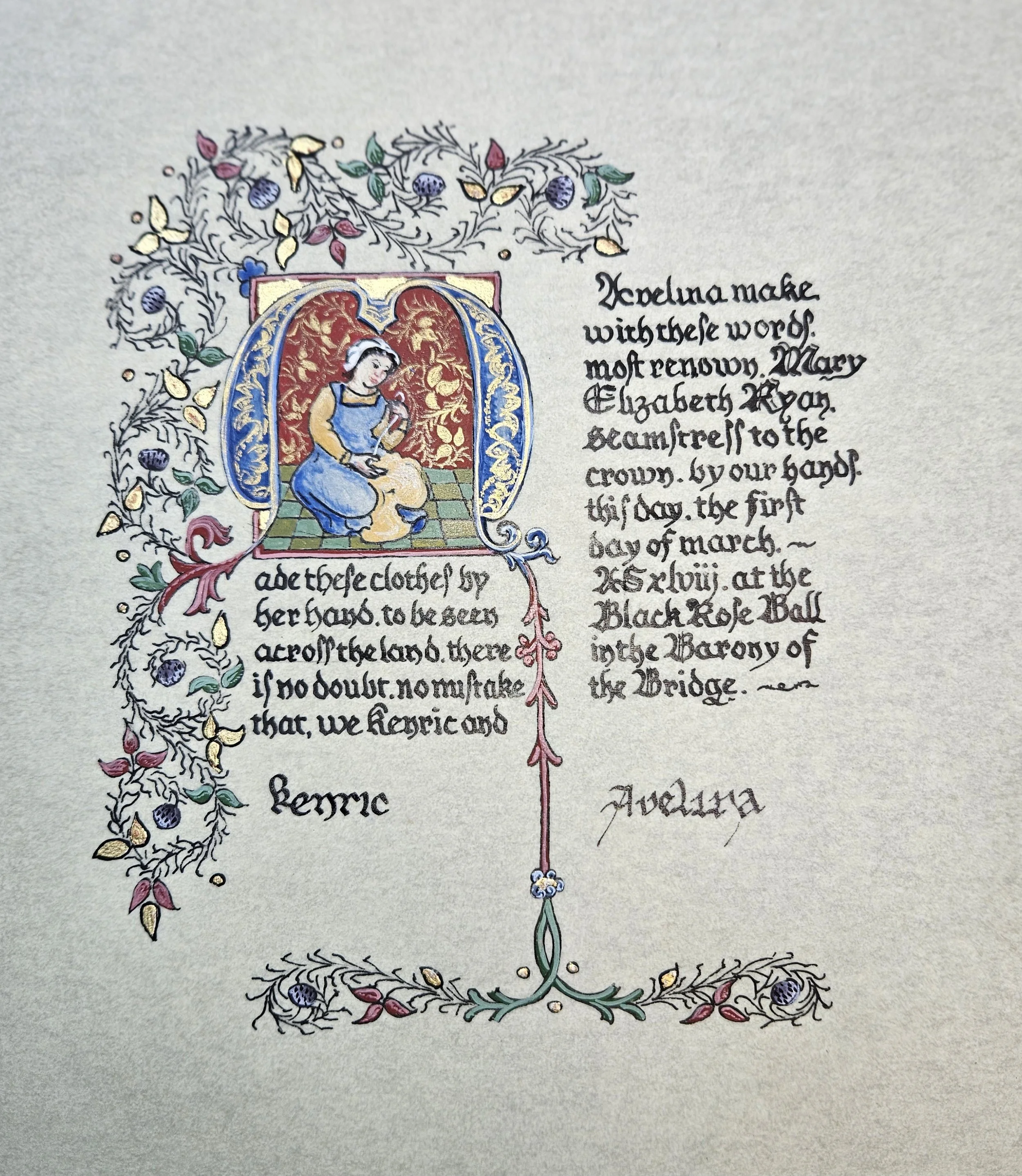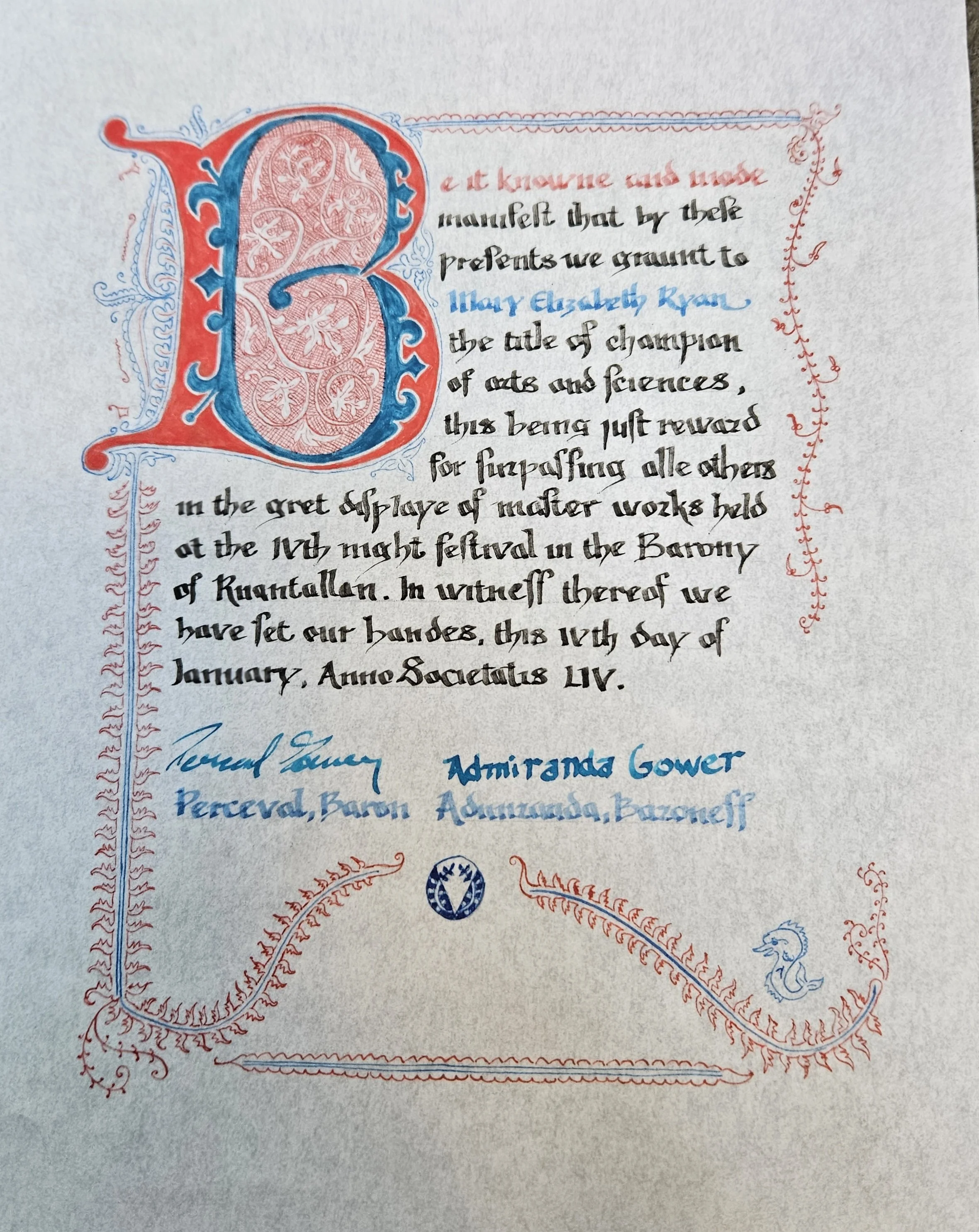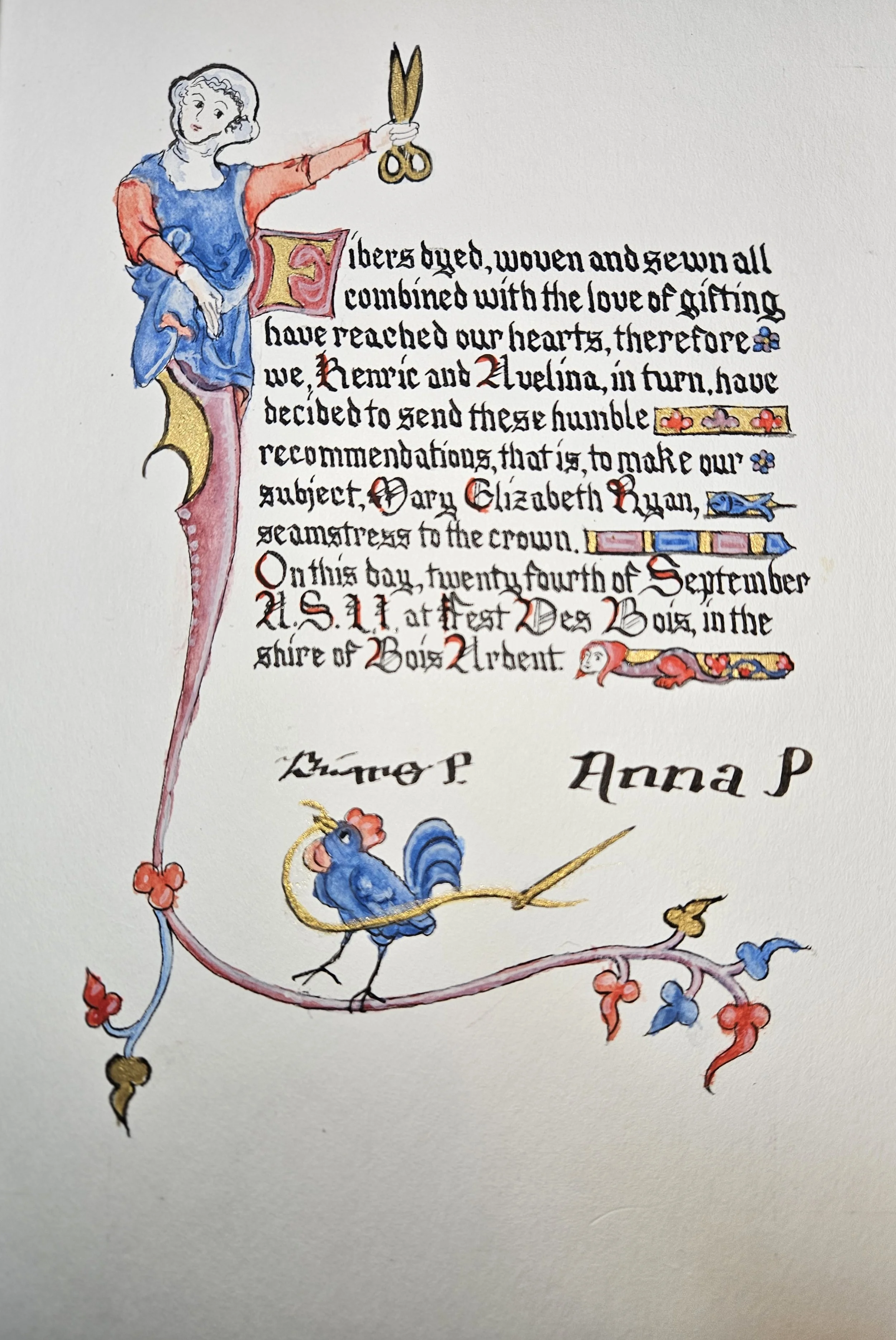 Funny story….the calligrapher mixed up the Princess’ and Prince’s scrolls, so Delyth’s name is on this one and mine is incorrectly added to the Princess’ scroll that she has.